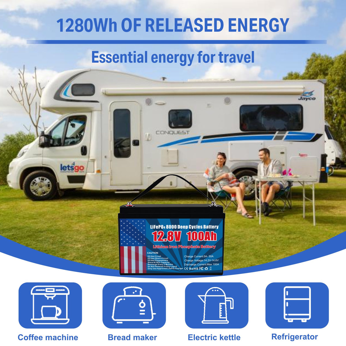 - 【1280Wh of Usable Energy Output】The 12V 100Ah LiFePO4 Battery provides a maximum power output of 1280Wh, which is two to three times that of a typical SLA battery of the same size. The maximum 100A continuous discharge current can power most electrical equipment.