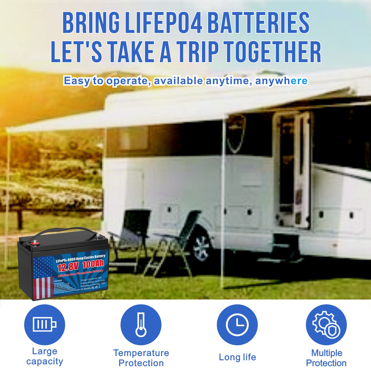 - 【Capacity Expansion & Widely Use】12.8V 100Ah Lifepo4 Batteries support series or parallel connecting. Powerful energy expansion system could be widely used for home storage system (avoiding the effects of power outages), RVs, backup power, off-grid system, Trolling Motor, Boat, Marine, trailer, automotive replacement Batteries, and outdoor activities. Much more flexible to DIY your own battery system.