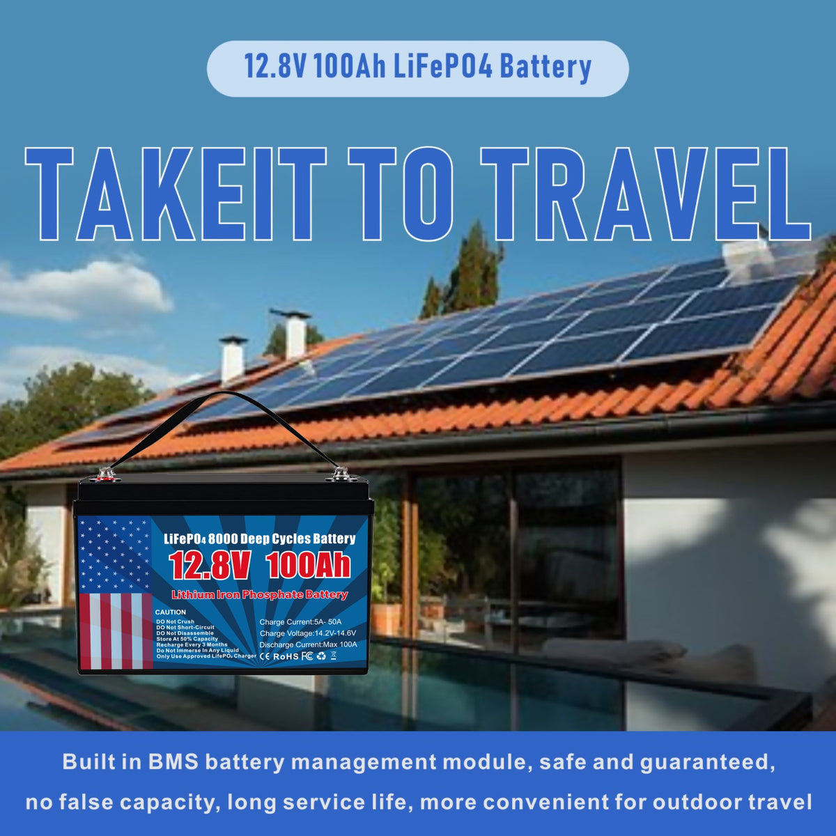 - 【100A BMS】LiFePO4 lithium batteries have a built-in BMS that protects against overcharging, over-discharging, over-current, and has an excellent self-discharge rate. The built-in high-temperature cutoff prevents charging temperatures from exceeding 50 °C. In addition, the battery can be recharged in three ways, including a lithium iron phosphate battery charger (14.6V 20A charger recommended with only 5 hours of fast charge time), a solar panel with controller, and an alternator (generator).