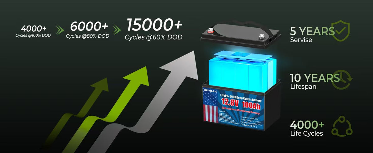 - 【10 Years Service Life】Marine Battery can reach 4000~15000 deep cycles, 4000 cycles at 100% DOD, 6000 cycles at 80% DOD, 15000 cycles at 60% DOD & a 10-year lifespan compared to 200~500 cycles & a 3-year lifespan in lead acid battery, which is equivalent to 6 lead-acid batteries. Discharging lead-acid batteries below 50% will shorten battery life, but lithium batteries will not.