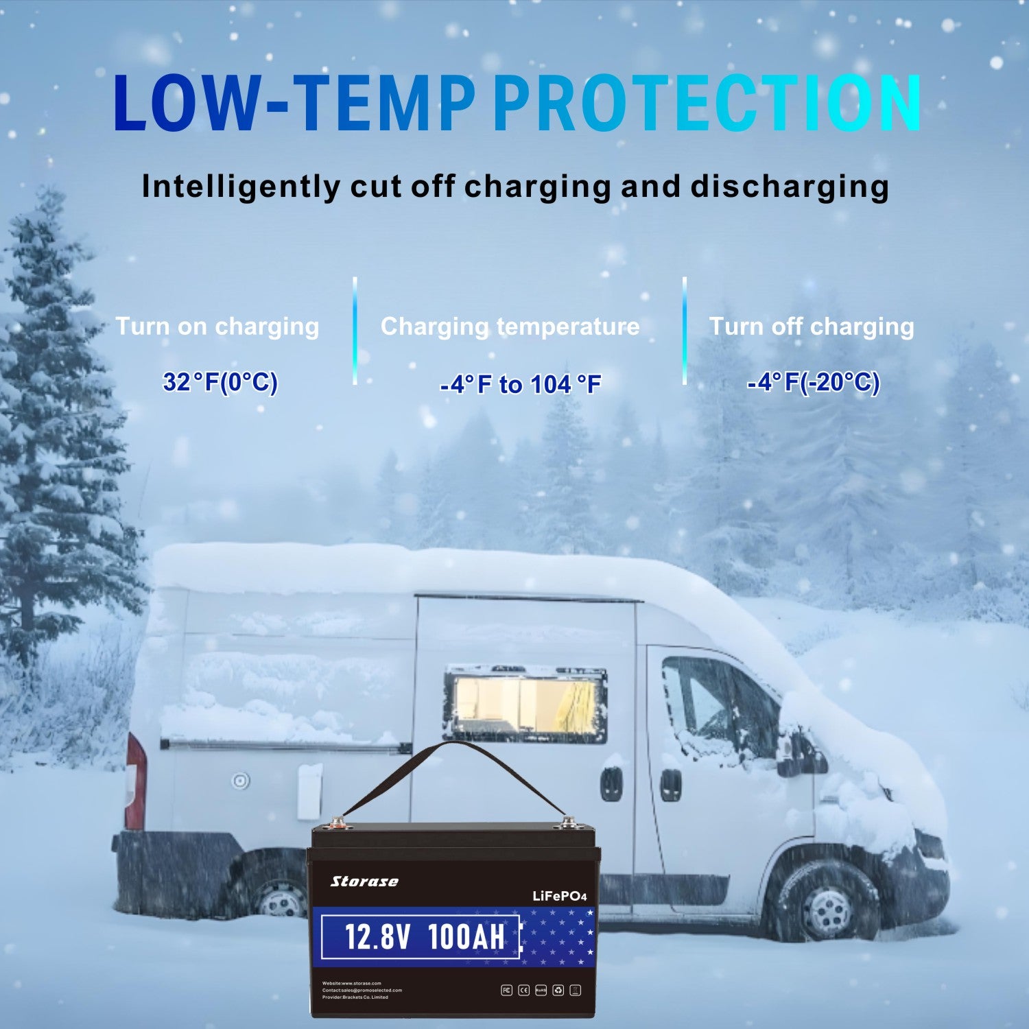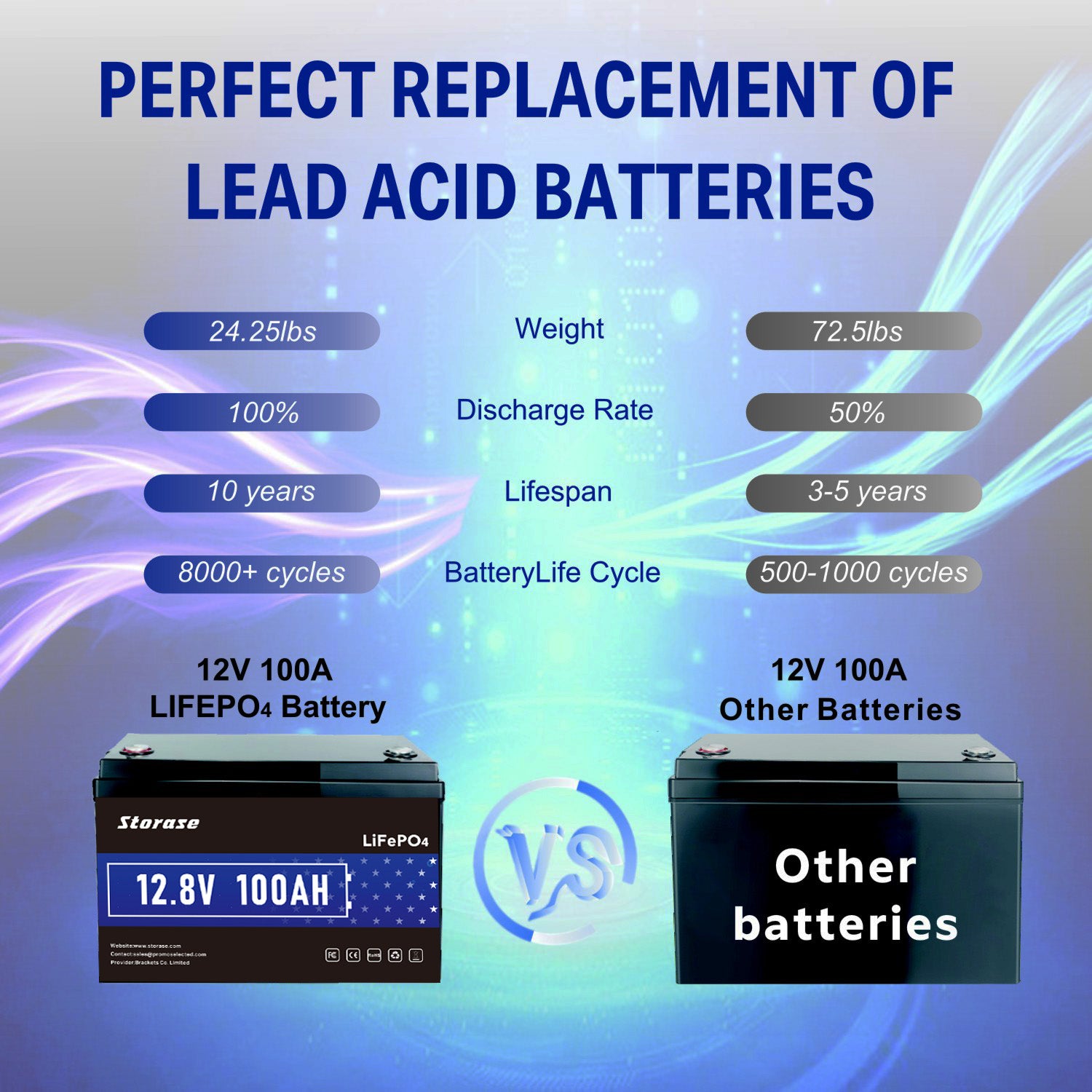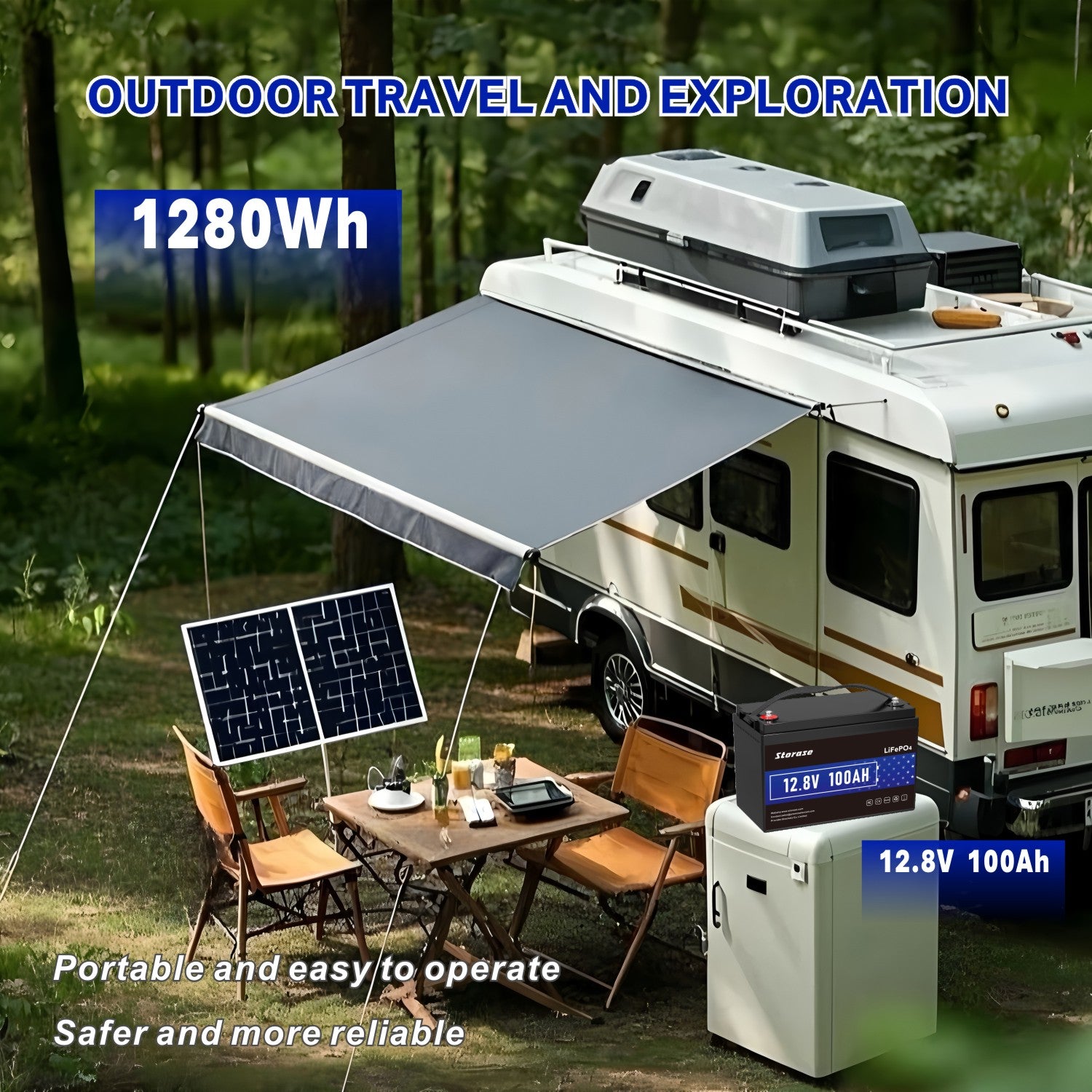 - 【1280Wh of Usable Energy Output】The 12V 100Ah LiFePO4 Battery provides a maximum power output of 1280Wh, which is two to three times that of a typical SLA battery of the same size. The maximum 100A continuous discharge current can power most electrical equipment.