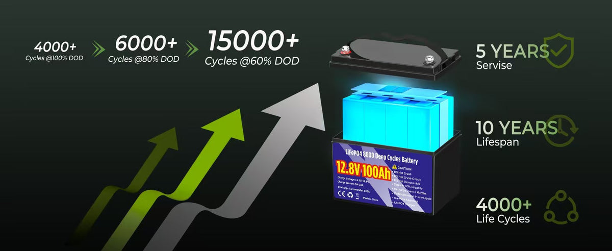 - 【10 Years Service Life】Marine Battery can reach 4000~15000 deep cycles, 4000 cycles at 100% DOD, 6000 cycles at 80% DOD, 15000 cycles at 60% DOD & a 10-year lifespan compared to 200~500 cycles & a 3-year lifespan in lead acid battery, which is equivalent to 6 lead-acid batteries. Discharging lead-acid batteries below 50% will shorten battery life, but lithium batteries will not.