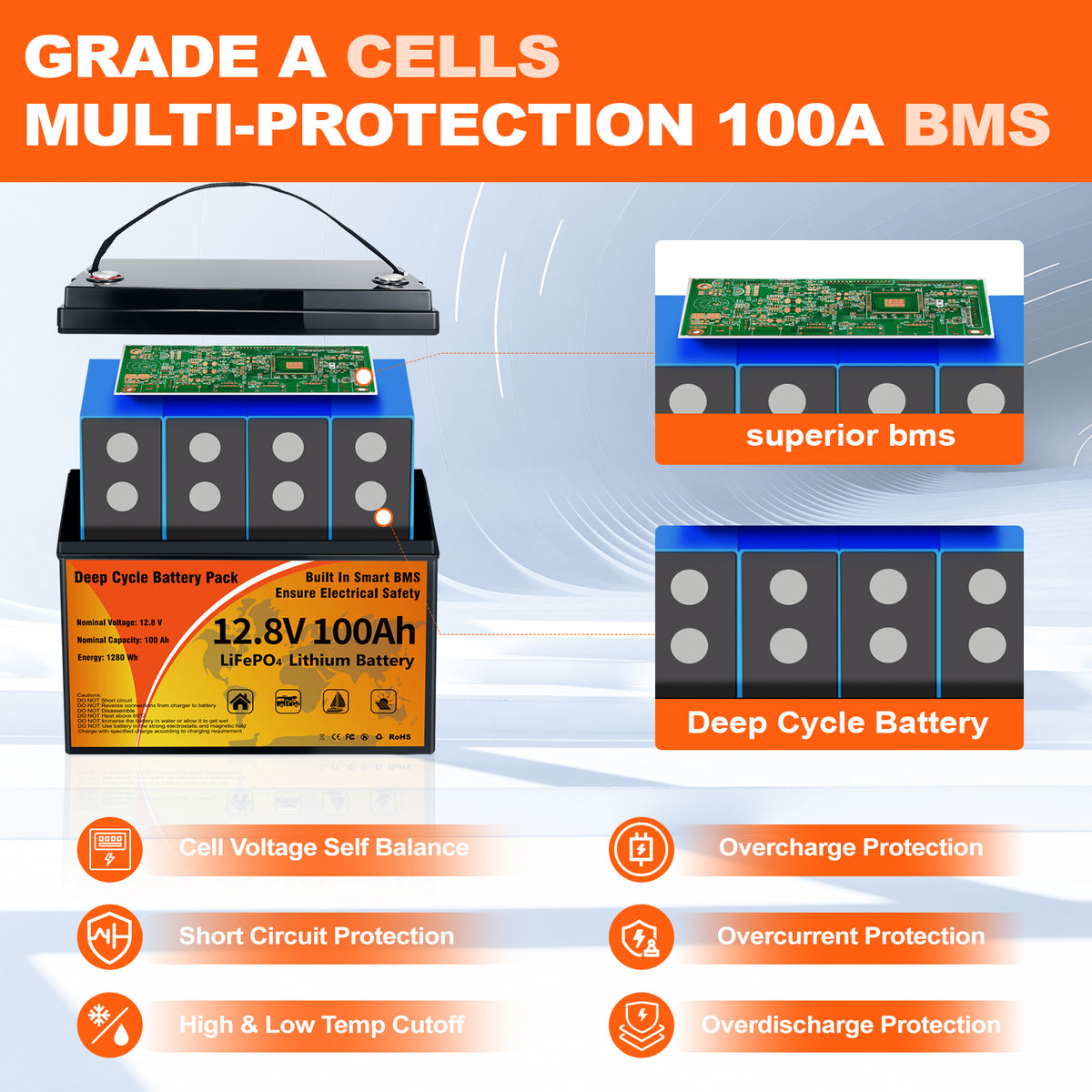 - 【Capacity Expansion & Widely Use】12.8V 100Ah Lifepo4 Batteries support series or parallel connecting. Powerful energy expansion system could be widely used for home storage system (avoiding the effects of power outages), RVs, backup power, off-grid system, Trolling Motor, Boat, Marine, trailer, automotive replacement Batteries, and outdoor activities. Much more flexible to DIY your own battery system.